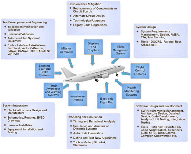 - Different sub systems such as Flight Control Systems, Flight Management Systems, Flat Panel Cockpit Displays for Primary Flight, Navigation and Engine Information, Crew Alerting Systems, Mission Computer Development, and Navigation Systems